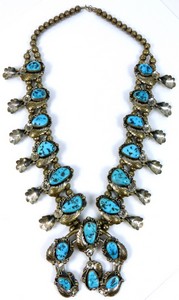 23 - NAVAJO SILVER & TURQUOISE SQUASH BLOSSOM NECKLACE Navajo silver & turquoise squash blossom necklace having 12 squash blossoms with naja pendant to center. Measures 22" (56cm) length. Total weight 178g.