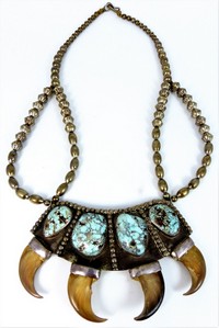 24 - NAVAJO TURQUOISE AND SILVER HORN NECKLACE Navajo turquoise and silver horn necklace having four tooth-form horn carvings, each with a beautiful turquoise stone set above. Pendant measures 4 3/8" (11.2cm) length. Necklace measures 20" (51cm).