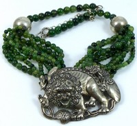 27 - T FOREE STERLING SILVER FOO DOG PENDANT NECKLACE Sterling silver foo lion pendant with a spinach jade beaded necklace. Pendant signed to backside 'T Foree' and marked 'STERLING'. Clasp marked '925'. Pendant measures 2 5/8" (6.8cm) length. Necklace measures 23" (58.5cm) length.