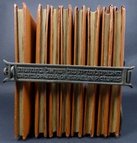 2 - ENCYCLOPEDIA OF ISRAEL 8 VOLUMES IN BRASS RACK Judaica Encyclopedia of Israel in pictures. Set of eight volumes, each leather-bound with a brass frontal plate. Published by Israel Publishing Co., Ltd, Tel-Aviv, 1950-51. Text in Hebrew, French and English with black and white photos. Titles consist of: The Children of Israel, A Tour Through Israel, Herzl, Chaim Weizmann, First President of the State of Israel, The Struggle For Jerusalem, Feasts and Festivals in Israel, Israel Reborn, How Israel is Governed.