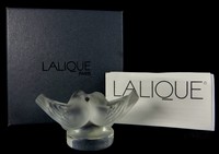 37 - LALIQUE FRENCH CRYSTAL LOVE BIRDS KISSING FIGURINE Lalique French crystal paperweight depicting love birds kissing. Signed to side of base. Includes original box. Paperweight measures 3" (7.5cm) width.