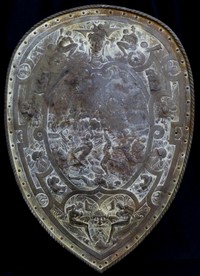 3 - ITALIAN BRONZE SHIELD WITH BATTLE SCENE IN RELIEF Italian bronze shield with battle scene to center panel. Circa 19th century. Measures 24" (61cm) x 17" (43cm).
