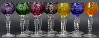 40 - 12pc BOHEMIAN CUT TO CLEAR CORDIALS 12 Bohemian cut-to-clear wine glass cordial goblets each with grape motif. Includes 2 of each ruby glass, cobalt blue, green, amber glass and cranberry glass; 1 each amethyst glass and orange. Each measures 5" (12.7cm) height.