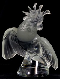 42 - LALIQUE FRANCE CRYSTAL 'ARA' COCKATOO Lalique France frosted and clear crystal 'Ara' cockatoo sculpture. Wings are partially spread and his head is turned back. Signed to back of perch and holds original label to front. Measures 11 1/8" (28.2cm) height x 10 1/2" (26.5cm) width.