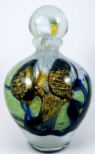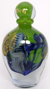 44 - JEAN-CLAUDE NOVARO STUDIO ART GLASS DECANTER Jean-Claude Novaro (French, 1943-2014) art glass decanter bottle with stopper. Titled 'Flacon Green Paysages'. Signed and dated 2005 to bottom. Measures 8 1/4" (21cm) height.