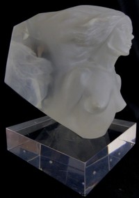 7 - FREDERICK HART 'MEMOIR' ACRYLIC SCULPTURE Frederick E. Hart (1943-1999) double-casted lucite sculpture titled 'Memoir'. Depicts a large naturalistic block of lucite with two nude female figurines emerging from either side. Signed to lower side of sculpture. Initialed, numbered and dated 1985 to opposite side of sculpture. Measures 9 1/2" (24cm) height + 2 1/4" (5.5cm) lucite base. Includes lighted and manually rotating pedestal measuring 44 1/2" (113cm) height x 12" (30.5cm) square.