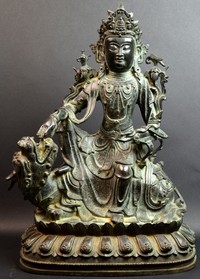 17 - 18th C CHINESE BRONZE FIGURE OF GUANYIN ON UNICORN 18th century Chinese bronze sculpture depicting Quan Yin atop a unicorn foo dog. Measures 20" (51cm) height x 15" (38cm) width.
