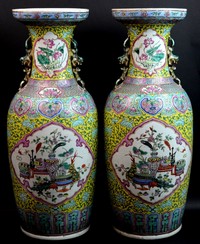 18 - PR 19th C CHINESE FAMILLE ROSE PORCELAIN VASES Pair of 19th century Famille Rose porcelain vases. Each having applied foo lion handles. Scrolled vine and floral designs over a yellow ground adorn panels depicting still life scenes. Each measures 24 1/2" (62cm) height.