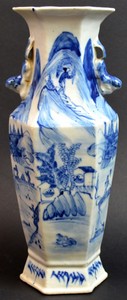 20 - 19th C CHINESE BLUE & WHITE PORCELAIN HEXAGON VASE 19th century Chinese blue and white porcelain vase of hexagonal form having applied foo lion handles. Depicts various landscapes scenes with villagers in boats. Back panel holds calligraphy poem. Measures 11" (28cm) height.