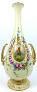 21 - ROYAL WORCESTER HANDLED PORCELAIN VASE w BOATS Royal Worcester ivory porcelain two-handled vase, style 2151, having hand painted floral designs to front and back. Oval panel to front displays sailboats at sea. Gold gilt accents throughout. Holds factory marks to underside and numbered 371075, 2151. Measures 11 1/4" (28.5cm) height.