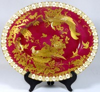 28 - ROYAL CROWN DERBY 'GOLD AVES' PORCELAIN PLATTER Royal Crown Derby porcelain platter in the 'Gold Aves' pattern with gold birds and floral branches over a maroon ground. Marked to underside. Measures 15 1/4" (38.5cm) length.