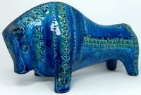2 - ALDO LONDI FOR BITOSSI RIMINI BLUE CERAMIC BULL Mid-century modern Italian Rimini Blue ceramic bull by Aldo Londi for Bitossi. Remnants of label to underside. Measures 12" (30.5cm) length.