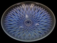 35 - R. LALIQUE OPALESCENT GLASS BOWL R. Lalique opalescent art deco glass bowl with stylized flower design and molded glass feet. Signed to outside of rim. Measures 11 3/4" (30cm) diameter.