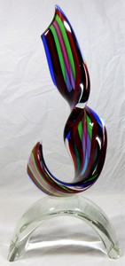 36 - LARGE MURANO ART GLASS RIBBON SCULPTURE Large Murano art glass ribbon sculpture in the style of Stefano Toso. Mounted on a clear glass arch form base. Measures 23" (58.5cm) height.