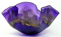45 - MATTHEW BUECHNER STUDIO ART GLASS BOWL Matthew Buechner for Thames Glass studio art glass basket form centerpiece bowl, purple with a gold abstract design. Signed to underside and dated 1993. Measures 12" (30.5cm) length.