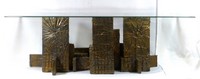 5 - PAUL EVANS BRUTALIST BRONZED WOODEN COFFEE TABLE Paul Evans geometric brutalist coffee table with glass top. Initialed to side of base and dated 1970. Base measures approx 37" (94cm) x 23" (58.5cm) x 15 1/2" (39.3cm) height. Glass measures 49 7/8" (126.5cm) x 24 3/4" (63cm).