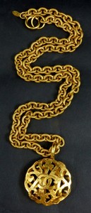 11 - CHANEL GOLD-TONE NECKLACE & PENDANT Chanel gold-color textured oval link chain and reticulated pendant. Chain marked 'Chanel, Made in France' to plaque. Pendant holds 'CC' logo to each side. Chain measures 32" (81cm) length. Pendant measures 2 3/8 (6cm) including bail.