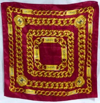 13 - CHANEL PARIS GOLD CHAIN SILK SCARF Chanel sink scarf with depictions of gold chains over a burgundy ground. Measures 34" (86cm) square.
