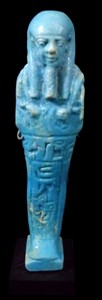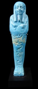 17 - LARGE EGYPTIAN FAIENCE USHABTI PTOLEMAIC PERIOD Large Egyptian blue faience ushabti from the late Ptolemaic period. The figure having Osirian false beard, holding two hoes with small bag to back left shoulder. Back pillar with trapezoidal pedestal. T-band of hieroglyphic inscription spanning the waist and continuing down the front of the leg case. Mounted on stand. Measures 5 1/2" (14cm) height + 1/2" (1cm) base.