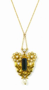 23 - VICTORIAN 14kt YG TOURMALINE & PEARL NECKLACE Victorian 14kt yellow gold pendant and necklace. Tourmaline measures 13mm x 5mm. Pendant measures 1 1/2" (3.7cm). Chain measures 19" (48cm).
