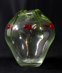 27 - ICED ARTE MURANO ART GLASS VASE Iced Arte Murano hand blown art glass vase, colorless with applied green and red decoration. Marked to underside. Measures 9 3/4" (25cm) height.