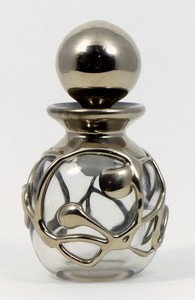 28 - WAYNE FILAN SILVERED MODERN ART GLASS DECANTER Wayne Filan American art glass decanter with stopper. Heavy silvered rope-like overlay to body. Signed and dated 1981 to underside. Measures 5 1/2" (14cm) height.
