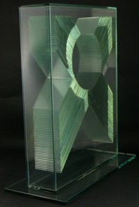 29 - STACKED ART GLASS SCULPTURE Numerous stacked panels of glass of varying sizes forming an 'X' like shape. Mounted inside glass display case. Measures 19" (48cm) height x 17" (43cm) width.