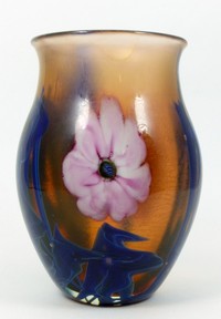 2 - JOSH SIMPSON STUDIO ART GLASS VASE Josh Simpson (New Mexico) studio art glass vase with floral motif and interesting threaded craquelure design to interior. Signed and dated 1980 to underside. Measures 5 7/8" (15cm) height.