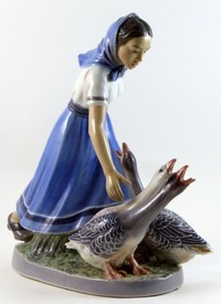 32 - DAHL JENSEN COPENHAGEN PORCELAIN GIRL w GOOSE Dahl Jensen Copenhagen porcelain figurine depicting a girl with three geese. Marked to underside and numbered 1296. Measures 8 1/2" (21.5cm) height.