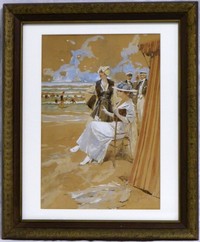 33 - JAN GOTH MIXED MEDIA ON PAPER BEACH SCENE 1918 Jan Goth (Czech, 1889-1959) watercolor and pastel on paper depicting multiple figures on a beach. Signed lower right and dated 1918. 17 1/4" (43.8cm) x 11 3/4" (30cm) + 3" (7.5cm) mat & frame.