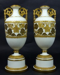 34 - PR GRAINGER & CO ROYAL WORCESTER PORCELAIN URNS Pair of antique Grainger & Co Royal Worcester handled porcelain vases. Each having leaf motif in relief with gilt accents. Each marked to underside and numbered 1, 1352. Each measures 10" (25.5cm) height.