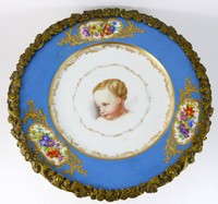 35a - SEVRES GILT METAL MOUNTED TAZZA w PORTRAIT OF BOY Sevres style porcelain gilt metal mounted compote. Boy's head to center surrounded by three floral sprays with heavy gold gilding. Measures 10 1/4" (26cm) diameter.