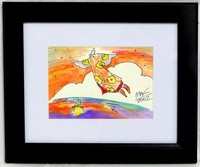 37 - PETER MAX 'ANGEL IN FLIGHT' WATERCOLOR Peter Max (American/German, b. 1937) watercolor on paper depicting an angel in flight with a sailboat below. Signed lower right and dated 2002. Measures 6 1/2" (16.5cm) x 4 1/2" (11.4cm) + 2 3/4" (7cm) mat & frame.