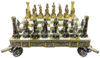 3 - GUISEPPE VASARI GILT METAL NAPOLEONIC CHESS SET Giuseppe Vasari gilt metal chess set and board. Figural armies depict the Battle of Waterloo. Complete set includes 32 pieces and gilt metal mounted onyx chess board rising on cannon supports. Signed 'Vasari' to castles. Chess board measures 21 1/2" (54.5cm) square from cannon to cannon. Largest figure measures 4 7/8" (12.5cm) height.