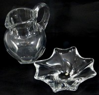 40 - 2pc BACCARAT CRYSTAL PITCHER & DISH Baccarat glass pitcher and dish. Each marked to underside. Pitcher measures 6 1/2" (16.5cm) height. Dish measures 6 3/4" (17.2cm) length.
