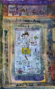 42 - YNEZ JOHNSTON RAJPUT SERIES 4 MIXED MEDIA ON PAPER Ynez Johnston (American, born 1920) sumi ink, dyes and acrylic painting on handmade rice paper. Titled "Rajput Series 4". Signed lower right and dated 1977. Measures 21" (53.3cm) x 13" (33cm) + 3 1/2" (9cm) mat & frame.