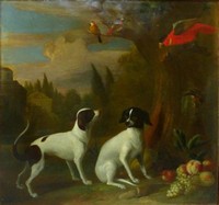 47a - JACOB BOGDANI OIL PAINTING ON CANVAS BIRDS & DOGS Oil painting on canvas depicting a landscape with exotic birds and two dogs attributed to Jacob Bogdány(Hungarian, 1660-1724). Signed lower left. Measures 40" (101.5cm) x 39" (99cm) + 1 3/4" (4.5cm) frame. Alternative spelling Jakob Bogdany.