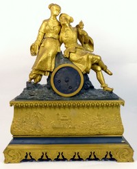 4 - FRENCH GILT DORE BRONZE CHINOISERIE CLOCK 19th century French gilt dore bronze Chinoiserie mantle clock. Two highly detailed lovers enjoying a cup of tea raised on a rectangular base cast with depictions of pagodas and trees and several royal figures in a boat. Measures 17 3/4" (45cm) x 14 1/2" (36.8cm) height.