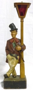 5 - KARL GRIESBAUM MECHANICAL CARVED WOOD WHISTLER Karl Griesbaum German carved wood mechanical whistler with arm around lamp post. Marked Germany to back of mechanism. Holds KG mark with bird to mechanism, side of base and bottom of base. Measures 19" (48.2cm) height.