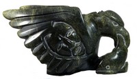 7 - TOONOO SHARKY 'BIRD SPIRITS' SERPENTINE SCULPTURE Toonoo Sharky, RCA (Cape Dorset, b. 1970) large Inuit serpentine carving depicting a bird having carved masks throughout and fish in mouth. Dated 1993 and initialed 'TS'. Measures approx 17" (43cm) x 11" (28cm).