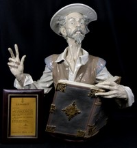 10 - LLADRO 'LISTEN TO DON QUIXOTE' PORCELAIN FIGURINE Lladro porcelain figure titled 'Listen to Don Quixote', #1520. Depicts Don Quixote holding a book with his left hand while his right hand is raised. Includes Certificate of Authenticity and wooden stand. Number 195/750. Marked to underside. Measures 20 1/2" (51cm) height plus base.