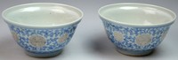 12 - PR 19th C CHINESE BLUE & WHITE COPPER RED BOWLS Pair of 19th century Chinese blue and white with copper red glazed porcelain bowls having a scrolled design. Each measures 4 3/4" (12.3cm) diameter x 2 1/2" (6.3cm) height.