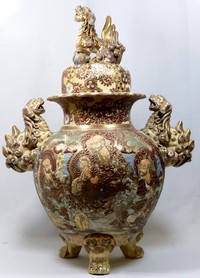 16 - MONUMENTAL JAPANESE SATSUMA CENSER 31" Antique Japanese monumental Satsuma censer having a jar-form body with tripod lion-head feet and foo lion form handles High domed cover with a flattened top mounted with an open mouth lion finial. Hand painted panels to front and back with chrysanthemum designs throughout. Signed to inside of lid and inside rim of censer. Measures 31" (79cm) height.