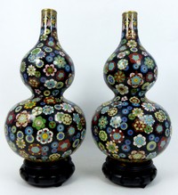 17 - PR CHINESE CLOISONNE ENAMELED DOUBLE GOURD VASES Pair of Chinese cloisonne enameled double gourd vases with millefleur pattern over a black ground. Each measures 8 1/4" (20.7cm) height + 1" (2.5cm) wooden base.