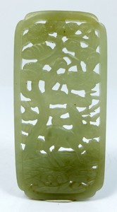 18 - CHINESE CARVED JADE DEER PENDANT Chinese carved jade pendant depicting a deer surrounded by pine trees. Pierced and has a slight curvature. Measures 2 5/8" (6.6cm). Total weight 18g.