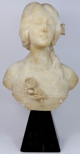 1 - GIOVANNI PINOTTI CIPRIANI ALABASTER BUST Giovanni Pinotti Cipriani (French, Late 19th century) alabaster bust of a young woman on a trapezoidal marble plinth. Signed to back of bust. Measures 12 1/4" (31cm) + 5" (12.5cm) marble base.