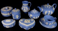 21 - 9pc WEDGWOOD JASPERWARE BLUE & WHITE 9 pieces of Wedgwood jasperware including teapot, sugar, creamer, cup, saucer and four lidded boxes. Each piece impressed Wedgwood to underside. Largest measures 8 1/2" (21.5cm) length.