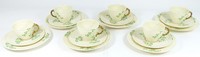22 - 18pc IRISH BELLEEK PORCELAIN DESSERT SET Irish Belleek service for 6 dessert set with basketweave texture and hand painted clovers. Each with black Belleek mark to underside. Includes 6 teacups 4" (10cm) length, 6 saucers 5 1/2" (14cm) diameter and 6 dessert plates 7" (18cm) diameter.