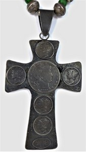 28 - KENNY RAY MCNEILLY CRUCIFIX COIN PENDANT NECKLACE Kenny Ray Mcneilly Jr sterling silver crucifix pendant with six American silver coins attached to a beaded necklace. Pendant signed and marked 'STERLING'. Pendant measures 4" (10cm) height. Necklace measures 23" (58.5cm) length. Total weight 124g.