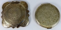 29 - 2pc MEXICAN STERLING SILVER ENGRAVED COMPACTS Two Mexican sterling silver compacts with Aztec calendar engraved to the top of each. Round compact marked 'MEXICO, STERLING 925' with additional hallmarks. Other compact marked 'STERLING' to lid. Largest measures 2 7/8" (7.3cm) width. Total weight 4.2ozt (130g).